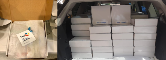 SnackMagic treats in 145 boxes are packed, shipped, and delivered.